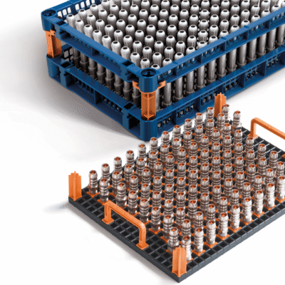 Industriekörbe und Werkstückträger im All-in-One System. Geeignet für Transport, Lagerung und Reinigung von sensiblen Bauteilen.