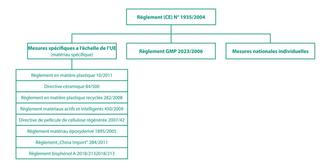 Están subordinadas al Reglamento marco las medidas individuales para toda la UE (reglamentos específicos de materiales), el Reglamento (CE) n.° 2023/2008 sobre buenas prácticas de fabricación y las medidas individuales nacionales.