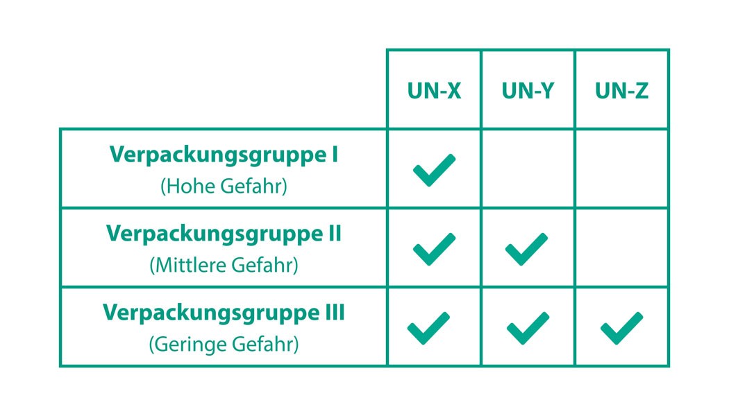 Die Verpackungsgruppen I, II, III beziehen sich auf die Stoffe, die verpackt werden. Den Verpackungsgruppen wurden jeweils Buchstaben X, Y oder Z zugewiesen die aufzeigen, welche Verpackung für das Gefahrgut erlaubt ist.